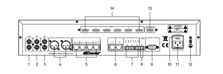 Kết nối với thiết bị nguồn âm thanh hoặc bàn trộn để đưa tín hiệu âm thanh dạng line vào hệ thống.
