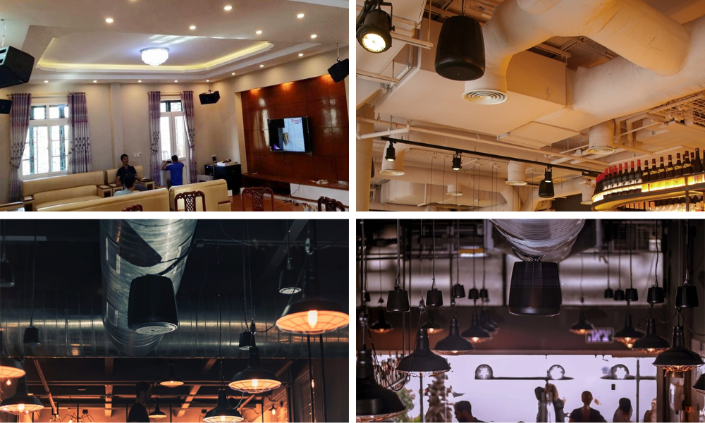 - Nhà hàng, khách sạn, quán cà phê: loa thả trần hoặc treo nổi giúp nhạc nền lan tỏa nhẹ nhàng, không gây chói tai.